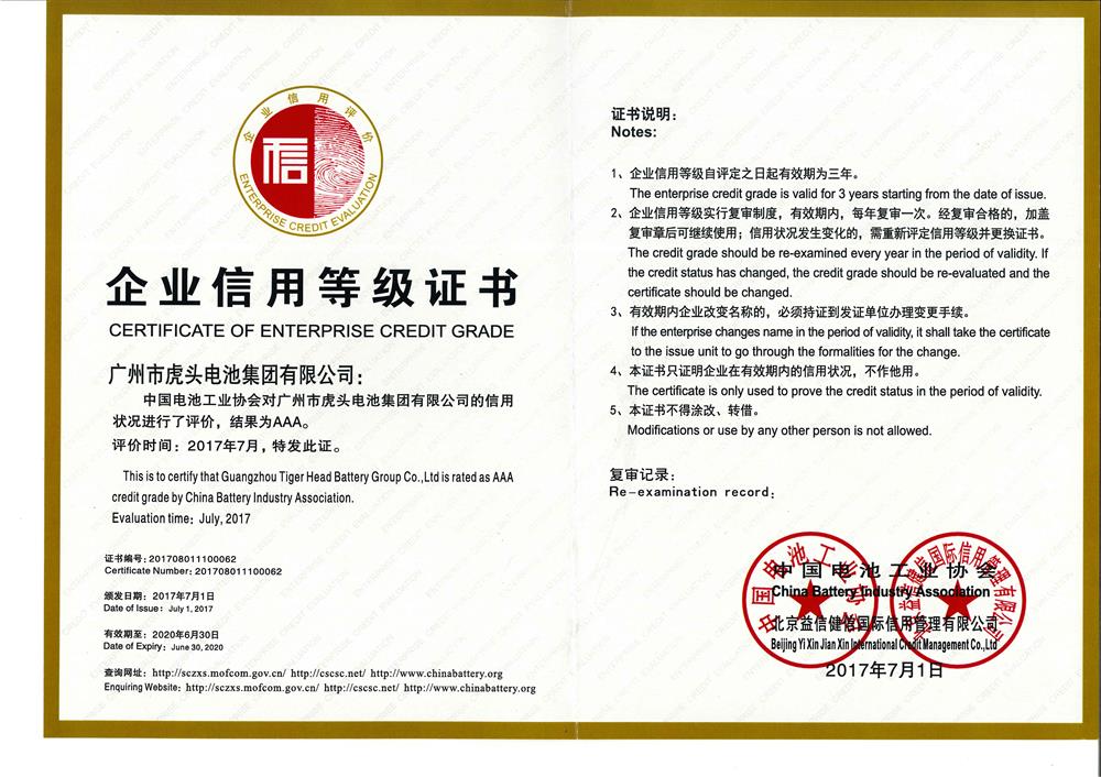2017 شهادة جمعية صناعة البطاريات الصينية من الدرجة الائتمانية AAA للمؤسسة