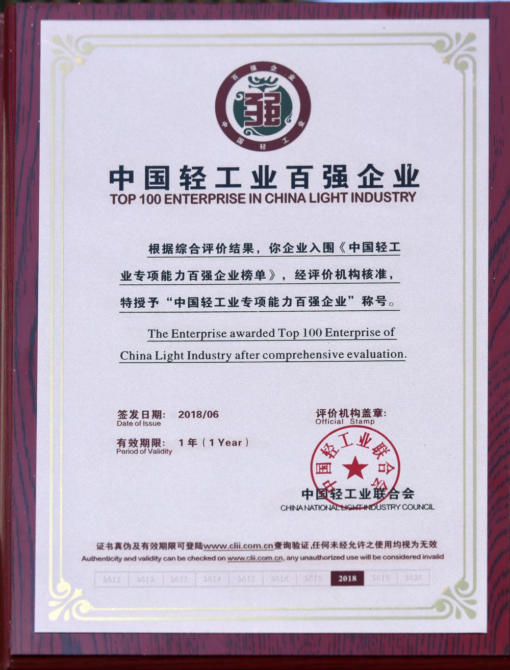 أفضل 100 مؤسسة في الصناعة الخفيفة في الصين لعام 2018