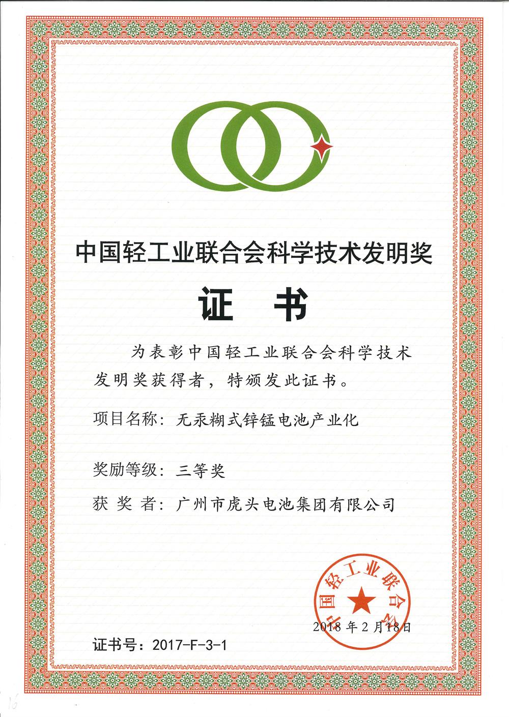 الجائزة الثالثة لجائزة اختراع العلوم والتكنولوجيا لعام 2018 من المجلس الوطني الصيني للصناعة الخفيفة