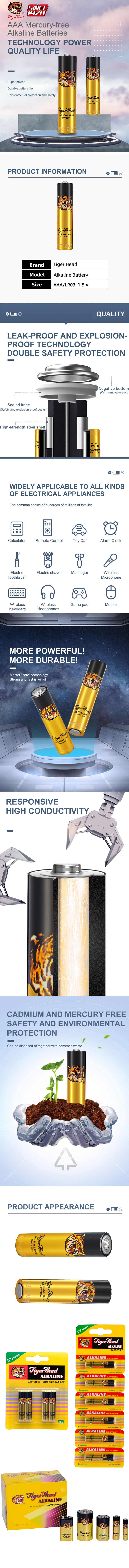 بطاريات قلوية LR03 بحجم AAA (بطاريات AAA) خالية من الزئبق، وتتميز بسعة عالية، وخصائص ممتازة، ونطاق استخدام واسع. لا تُلوث البيئة بالزئبق. سعتها أعلى بعدة مرات من البطاريات العادية.