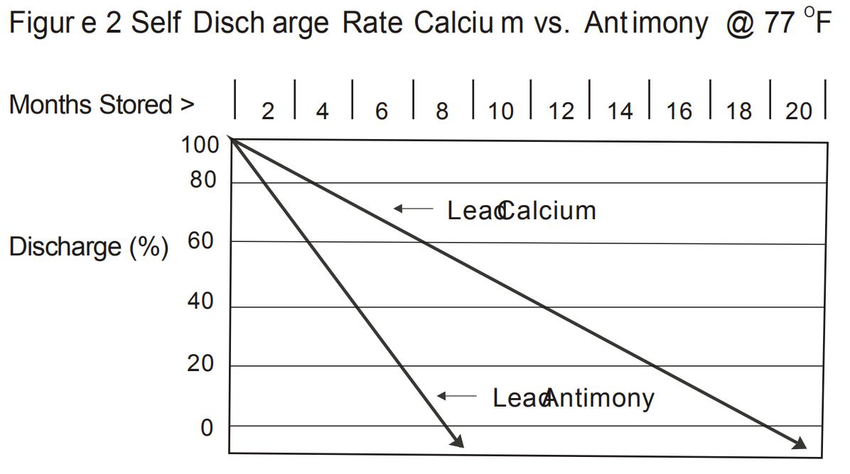 تتميز بطاريات الدراجات النارية المصنوعة من الرصاص/الكالسيوم بعمر أطول، إذ تحتفظ بشحنها لفترة أطول بثلاث مرات من بطاريات الرصاص/الأنتيمون التقليدية. تُفرّغ هذه البطاريات (التفريغ الذاتي) بمعدل أسبوعي يتراوح بين ٠.١٥٪ و٠.٣٪ تقريبًا. انظر الشكل ٢ على اليمين. تحتوي بعض بطاريات الرصاص/الكالسيوم أيضًا على مادة كيميائية خاصة تُقاوم تكوّن الكبريتات على ألواح البطارية.