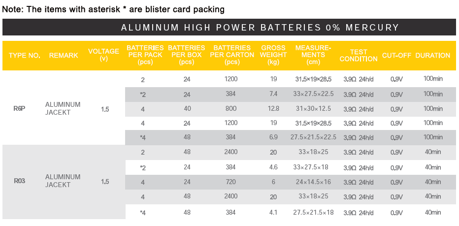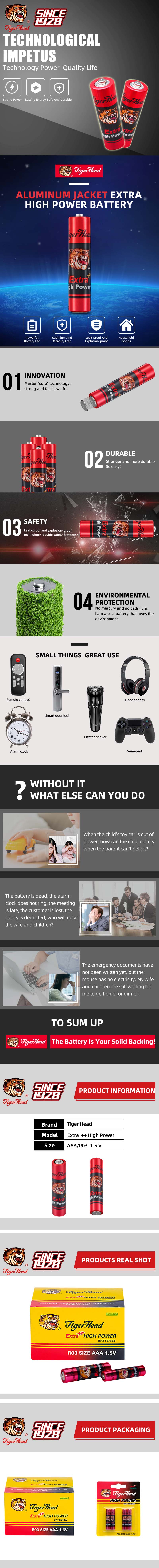 تتميز بطارية R03 aaa ذات الطاقة العالية الإضافية ++ بخصائص السعة العالية والممتلكات الجيدة ونطاق الاستخدام الواسع. لا تلوث الزئبق للبيئة. سعة البطارية أعلى بعدة مرات من البطارية العادية. كما ستوفر السترة المصنوعة من الألومنيوم للبطارية حماية أكثر متانة للبطارية.