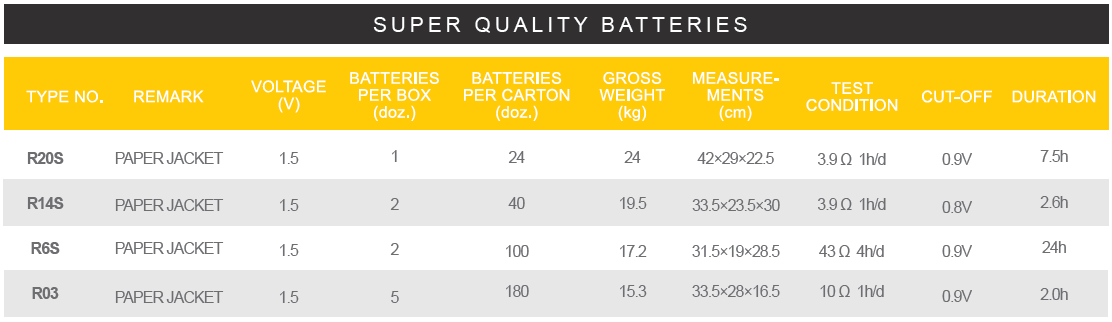 بطاريات السترة الورقية بحجم AAA R03 مصنوعة من مواد خام عالية الجودة وتتميز بخصائص الأغطية القابلة للحمل والمتينة والأداء الجيد والمانعة للتسرب والأغطية العصرية. إنها مناسبة للأجهزة المنزلية ذات التيار الكهربائي الكبير التي تستخدم بشكل مستمر وكذلك بشكل منفصل انخفاض السعة أثناء فترة التخزين مثل أجهزة الراديو الترانزستور والساعات وأجراس الأبواب والآلات الحاسبة وما إلى ذلك.
