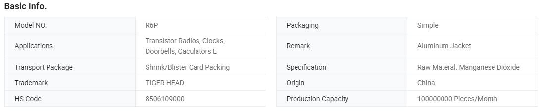 • بطارية رأس النمر من الكربون والزنك بالإضافة إلى بطارية شديدة التحمل مقاس AA مقاس R6p