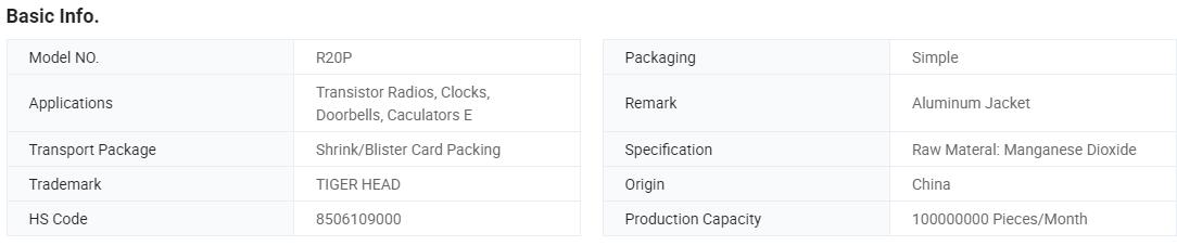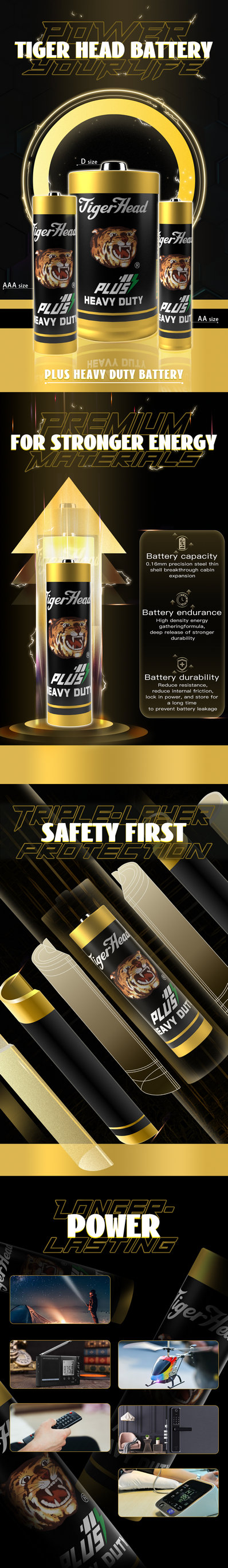 تتميز بطارية Tiger Head Plus للخدمة الشاقة بخصائص السعة العالية والممتلكات الجيدة ونطاق الاستخدام الواسع. لا تلوث الزئبق للبيئة. سعة البطارية أعلى بعدة مرات من البطارية العادية. كما ستوفر السترة المصنوعة من الألومنيوم للبطارية حماية أكثر متانة للبطارية.