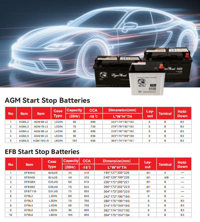 هل تبحث عن مورد موثوق لبطاريات بدء التشغيل/الإيقاف للسيارات ؟ نصنع ونوفر مجموعة كاملة من بطاريات بدء التشغيل/الإيقاف AGM وبطاريات بدء التشغيل/الإيقاف EFB لأسواق السيارات العالمية. تشمل مجموعتنا بطاريات AGM L2، AGM L3، AGM L4، AGM L5، AGM L6، بالإضافة إلى بطاريات EFB M42، EFB N55، EFB Q85، EFB S95، EFB T110، EFB L2، EFB L3، EFB L4، EFB L5، وEFB L6.